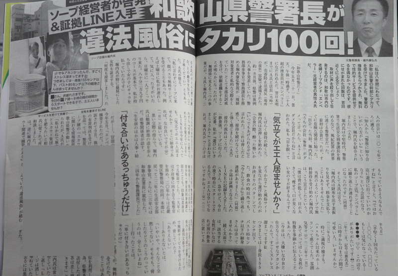 本日発売の文春です。ソープランドの経営者に便宜を図ってやるから…の状態で性接待を受けていた和歌山県警幹部が依願退職していたって話です。性接待で依願退職。みっともないのひと言です。しかもその甲斐なく、このソープランドに手入れが入ったのだからすくいようが無い。その容疑もスカウト絡みだからね。ここじゃなくてもってな案件ですね。そうなれば摘発された方も喋るよな。グレーな業界が警察や仁侠団体と上手くやる事を否定しない俺ですと言っておく。