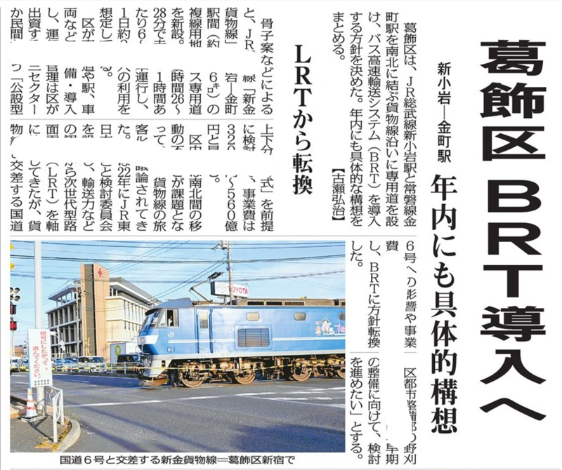 新金線はBRTで整備するって話です。個人的には中間駅に交換設備を作って、R6の踏切を立体化する。一応10両編成対応のホームを作り、新小岩と金町を2編成の電車が行ったり来たりする。車両は千葉にある209系4両編成から始めれば良い。BRTは中途半端だと思うけどね。過疎地じゃ無いのだから、それなりの需要はあると思います。でもBRTなんだよね。