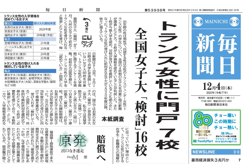 毎日新聞朝刊一面。女子大がトランス女性に門戸か。全く無縁の世界だ。でも生き残るなら非難を浴びても女子大を守るべきじゃないかな?そうじゃなければ諦めて共学化だね。トランス女性とかLGBTQに対して差別するって話じゃない。この事を利用したエセな連中に、ねじ込まれる気がする。