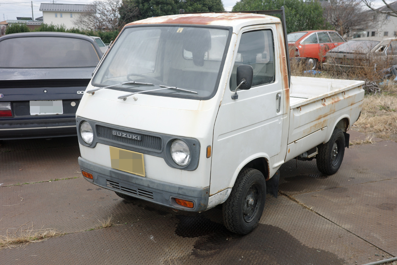1975年登録のスズキキャリィです。普通の黄色いナンバーが付いていたので、550ccかと思ったら、360ccだそうです。何でも、360ccの最後の方にこういう状態になったらしい。この組み合わせはレアだな。